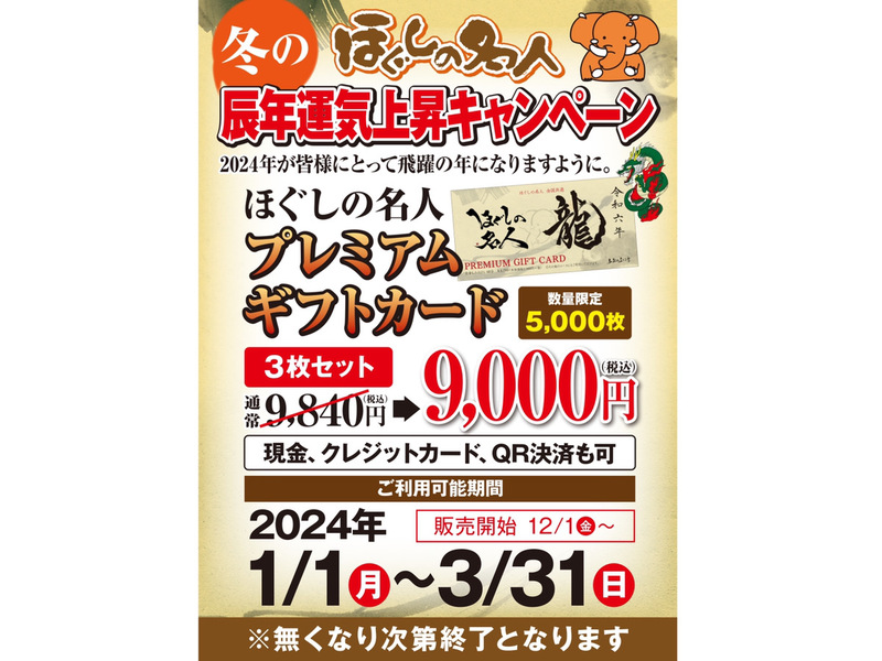 ほぐしの名人では、年末恒例のプレミアムギフトカードを店頭にて販売しております。
